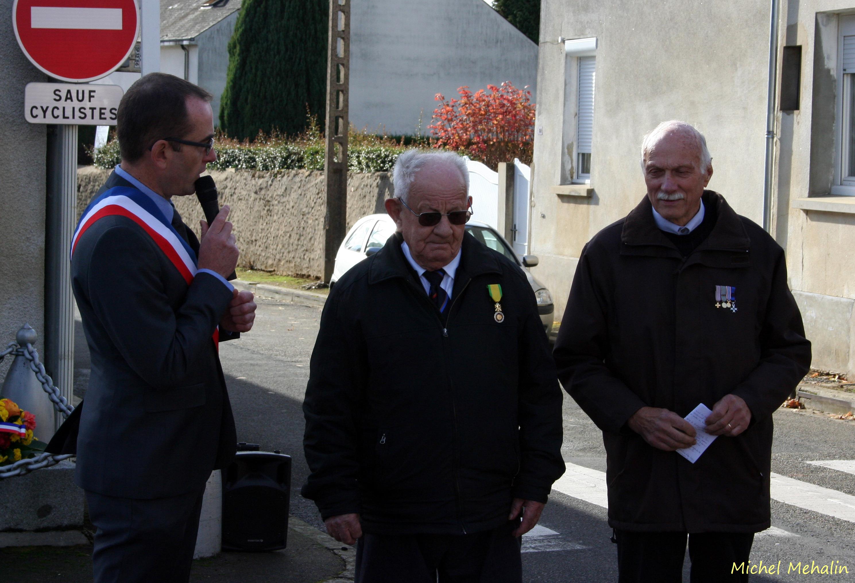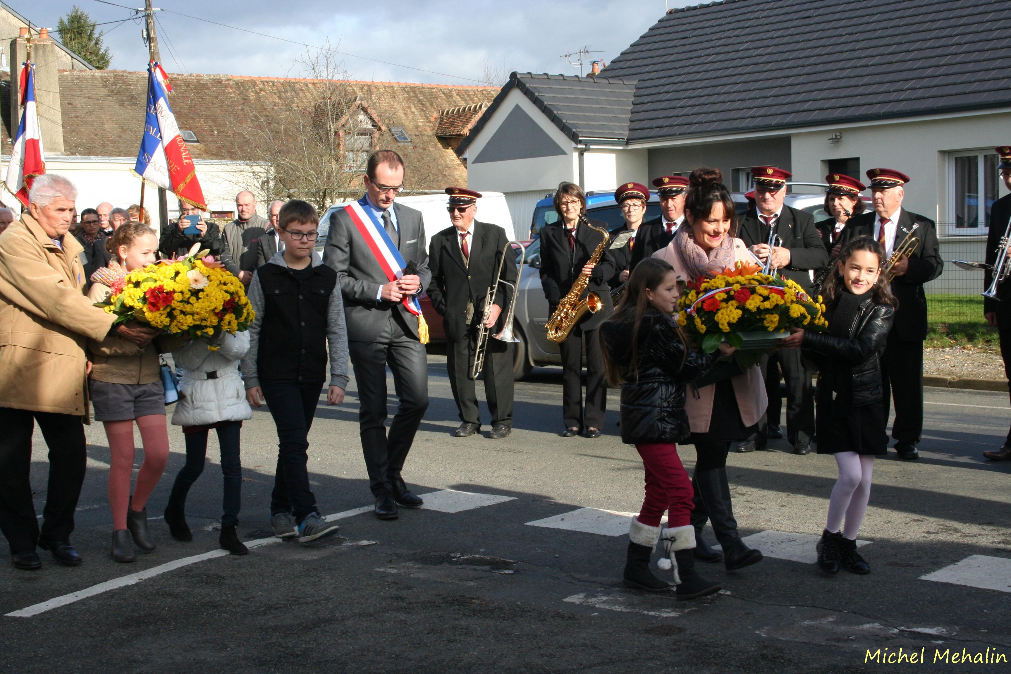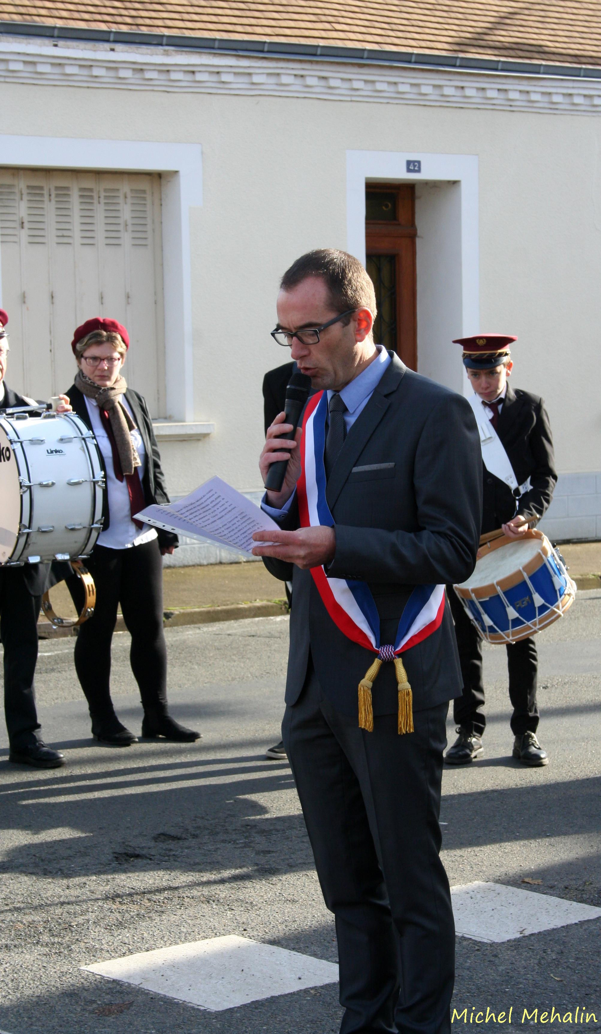 Emmené par l’harmonie municipale, le défilé s’est arrêté au Monument aux Morts. De nombreux habitants étaient présent, et de nombreux enfants également. 4 élèves de l’école, accompagnés de la directrice, ont lu 4 lettres de soldats écrites depuis le front. Puis ce fût l’appel des soldats de la commune morts au combat. Après la Marseillaise et le Chant des Partisans, David Chollet, maire, a mis à l’honneur Monsieur Léon Bouttier décoré le matin même en Préfecture de la Médaille Militaire.